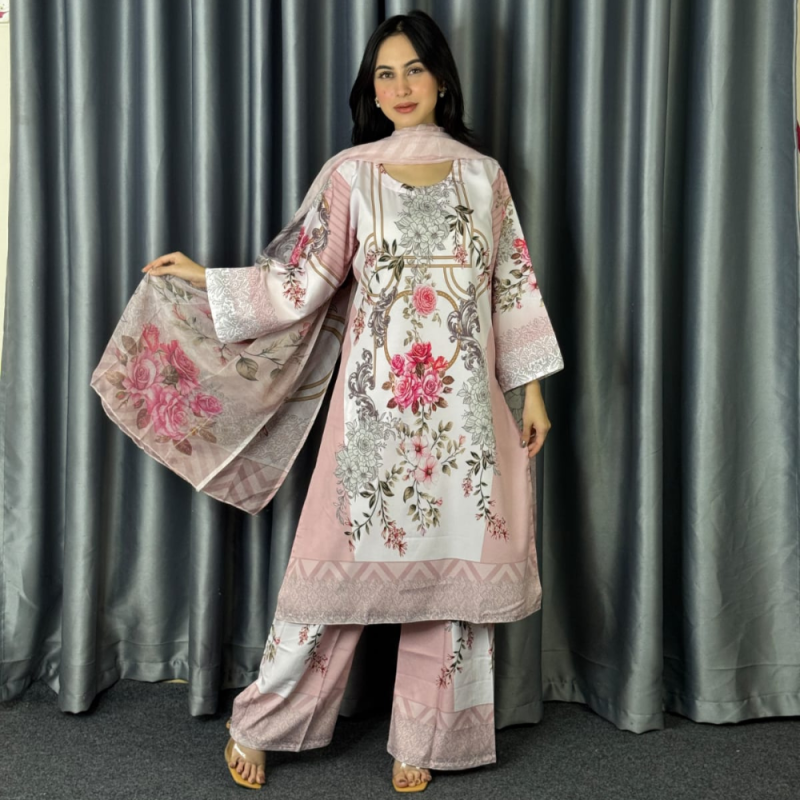 Experience the perfect blend of comfort and sophistication. Crafted from luxurious Dubai Silk with vibrant digital prints, this three-piece set adds a touch of elegance to any occasion.