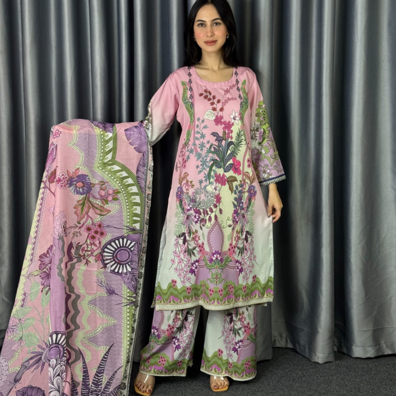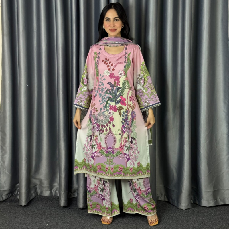 Experience the perfect blend of comfort and sophistication. Crafted from luxurious Dubai Silk with vibrant digital prints, this three-piece set adds a touch of elegance to any occasion.