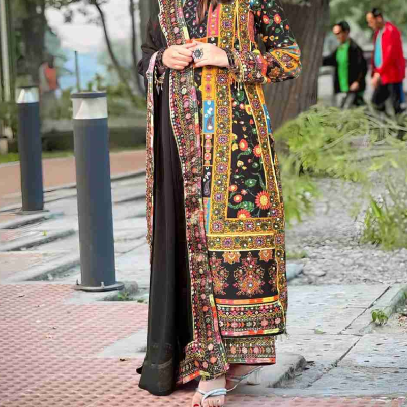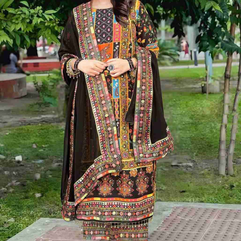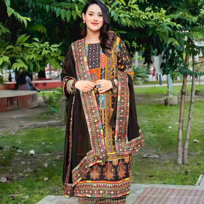 এই Digital Print Three Piece তৈরি হয়েছে নরম পাকিস্তানি Rayon Cotton কাপড়ে,
